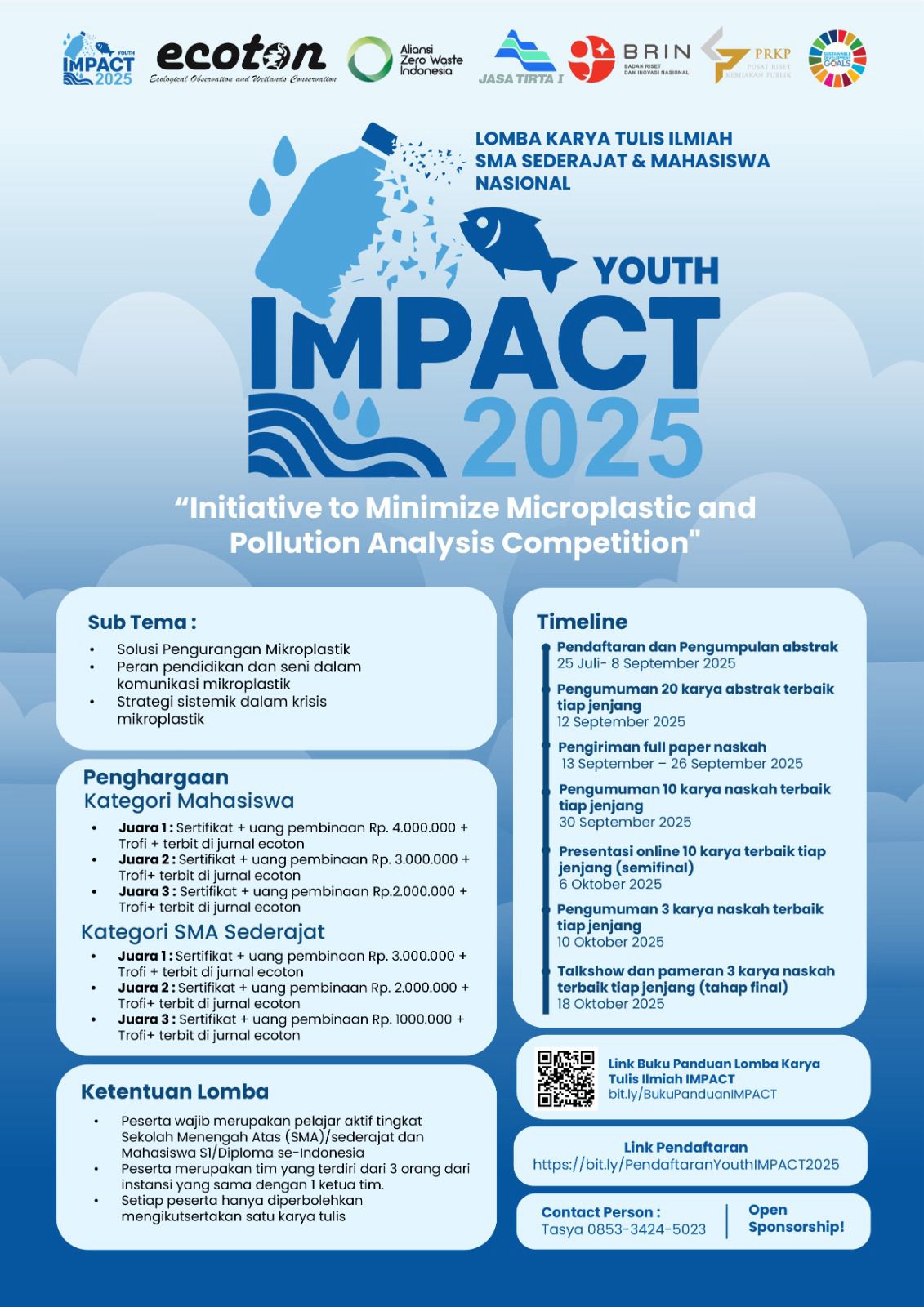 Hello Indonesian high school and university students! Concerned about the microplastic crisis? Join Youth IMPACT 2025, a free scientific writing competition for young environmental advocates. Explore creative ideas through three sub-themes: solutions to reduce microplastics, the role of education and arts in communication, and systemic strategies to address the microplastic crisis.