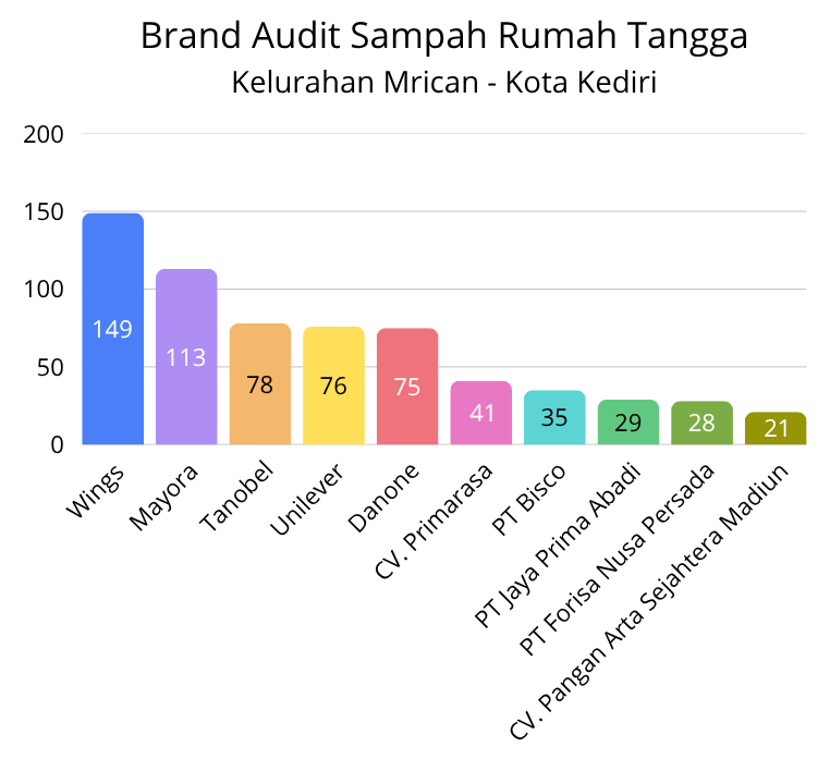 Berdasarkan hasil brand audit terhadap sampah yang terkumpul, ditemukan bahwa sampah kemasan sachet masih mendominasi. Produk dari Wings menjadi penyumbang terbesar dengan total 149 kemasan, disusul Mayora sebanyak 113 kemasan. Tanobel tercatat sebanyak 78 kemasan, Unilever 76 kemasan, dan Danone 75 kemasan. Selain itu, terdapat kontribusi dari CV. Primarasa (41 kemasan), PT Bisco (35 kemasan), PT Jaya Prima Abadi (29 kemasan), PT Forisa Nusa Persada (28 kemasan), serta CV. Pangan Arta Sejahtera Madiun sebanyak 21 kemasan.