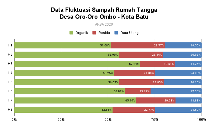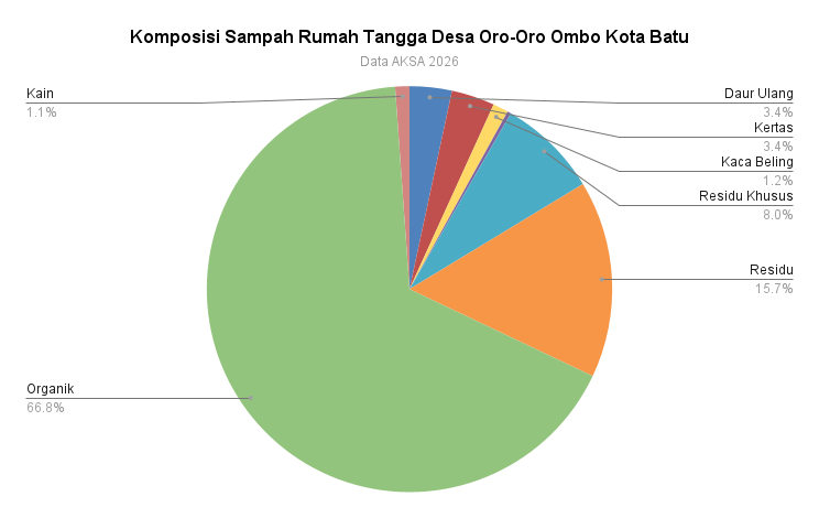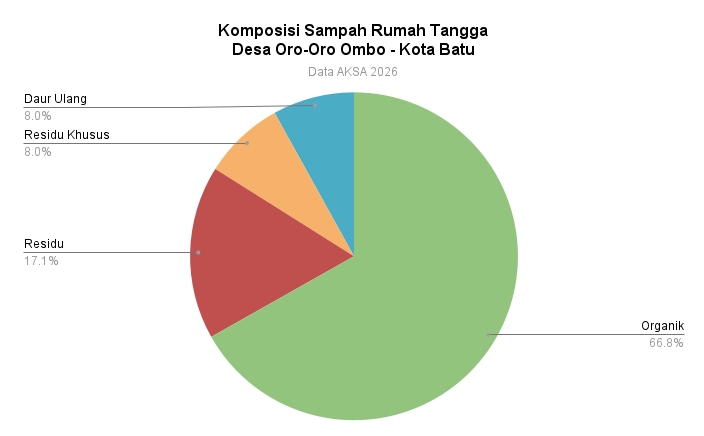 KOTA BATU — Sebanyak 50 rumah tangga di Desa Oro-Oro Ombo, Kota Batu, menghasilkan total 757,15 kilogram sampah hanya dalam waktu delapan hari. Data ini terungkap dalam kegiatan Analisis Karakteristik Sampah (AKSA) yang dilaksanakan pada 11–18 Februari 2026 sebagai bagian dari program Zero Waste Cities. Riset tersebut menemukan bahwa 66,8 persen timbulan sampah didominasi oleh sampah organik, membuka peluang besar pengurangan sampah dari sumbernya.
